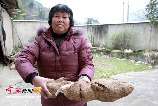 ![]() 宁海新闻网讯 近日,深甽镇岭徐村村民徐通尧在山上挖笋时挖到了一颗野生茯苓。这颗茯苓成长条形,重达4.9公斤,长65厘米,最长直径16厘米。茯苓俗称“四时神药”,不分四季,将它与各种药物配伍,不管寒、温、风、湿诸疾,都能发挥其独特功效。据村民们介绍,这么大的野生茯苓还是第一次见到。 (李江林赵士超摄) |