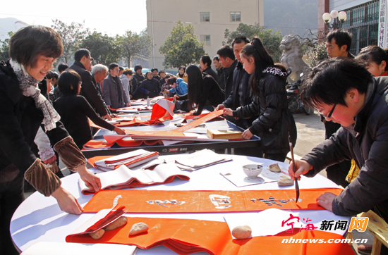 岔路镇天河村农村指导员最近邀请了县书法家协会部分骨干进村为村民义务写春联。(通讯员赵安炉摄)