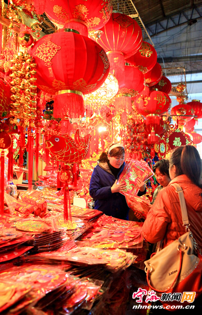 市民正在农贸市场挑选琳琅满目的传统喜庆饰品。