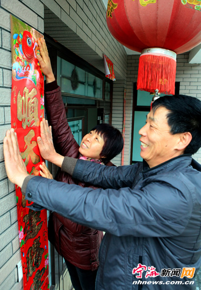 青珠村民苏伟金夫妇正在张贴大红对联。