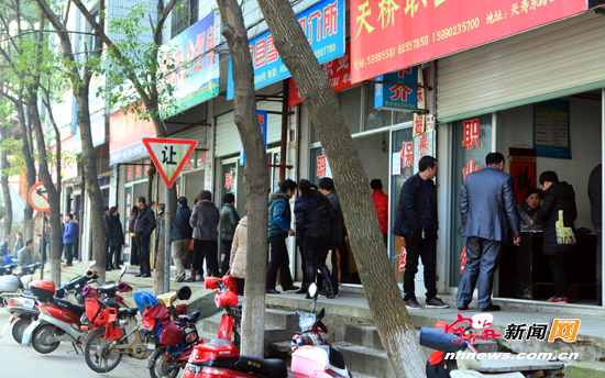 宁海新闻网讯 春节刚过,地处天寿东路的几家职业介绍所门前就热闹起来,昨日上午,记者在现场看到,有百余名来自县内外的求职者在这几家职介所进进出出。一位来自江西的大姐告诉记者,她希望通过职介所牵线搭桥,在宁海找到一份月薪2000元左右,相对轻松的工作。 (记者李江林摄)