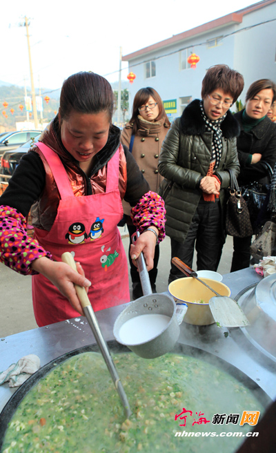 宁海新闻网讯正月十四,东岙一带有吃馏的传统习俗。当天,会有成千上万的人赶到东岙一带吃馏。馏相传始于戚继光抗倭年代,村民有感于戚家军衣食无着,纷纷拿出不多的杂粮混在一起,做成羹状,供军人充饥,此后年年相传沿续至今。当地还流传着“卅年夜的鼓,十四夜的肚”的民谚,意思是说,十四夜的肚子比平时要大好几倍,可吃十碗八碗的百家馏。这一夜各家主人非常欢迎人们到他家吃馏,吃的人越多主人就越高兴。今年十四夜,记者有幸来到一市镇武岙村,领略了当地家家户户制馏吃馏的风俗。 (记者李江林摄)