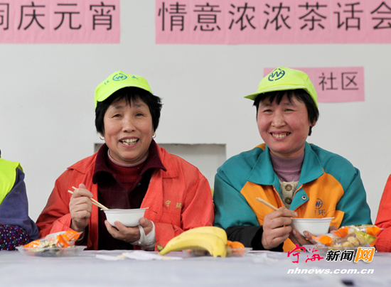 宁海新闻网讯 元宵佳节,跃龙街道北星社区的活动室里,辖区的环卫工人们欢聚一堂,人手一份慰问品,吃着甜蜜的汤团,个个脸上洋溢着开心的笑容。这是北星社区专门为这些城市美容师特别安排的一项元宵活动。(惠广亮郑洁摄)