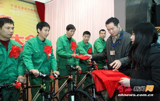 宁海新闻网讯 昨日下午,宁波如意股份有限公司表彰了2012年190余名先进个人和7个先进团队,并颁发十二项科技研发奖。奖品别出心裁,除了微波炉、自行车,还赠送免费二日游活动。(记者李江林摄)