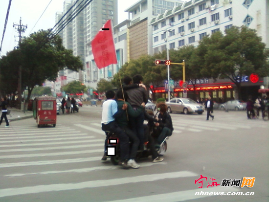 电动车上坐6人逆向快速闯红灯!(网友“山高路远”拍摄的一幕)