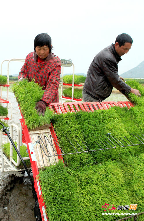 宁海新闻网讯 日前,宁海新天园农机专业合作社的承包田里一片繁忙,农机手们正利用新型高速插秧机插种早稻秧苗。据了解,宁海新天园农机专业合作社今年种植的350多亩早稻,全部采用效益高、质量好的机插作业,预计两台插秧机两天就可完成早稻播种工作。 (李江林葛棉棉摄)