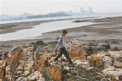孩子在宁海海湾玩耍。夜晚,这里会被回潮的海水淹没。