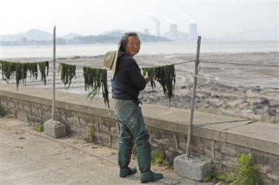 一位老人在海边捡拾海苔晾晒,晒干的海苔价格可以买到50元一斤。一天进账大约有500元。