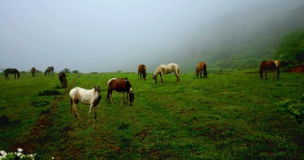 @超音速空间:徐霞客古道上美不胜收。与天台接壤的霞客次宿地弥陀庵附近的高山草甸上,一群马儿正留连在草地上啃食嫩草,是否酷似在蒙古草原啊?!