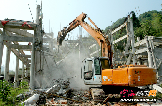 宁海新闻网讯 昨日上午,梅林街道联合国土资源、城管、公安等部门来到地处刘三村的郭晋禅寺,将这座寺庙正在违法扩建的大殿和厢房进行拆除。据了解,为全力推进“三改一拆”行动,全县各乡镇(街道)将结合民间宗教信仰点整治,对辖区范围内排摸出的违建寺庙进行分阶段拆除。 (李江林徐丽摄)