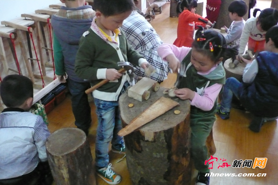 “先把奶油敷在蛋糕上,然后一只手转动转盘,另一只手拿好抹刀把奶油抹匀……”老师一边讲解做蛋糕的要领,一边亲身示范,戴着厨帽、围着围裙的小朋友则认真地现学现做!转眼间一个漂亮的小蛋糕就做好了,欢笑声回荡在小厨房内。 这是潘天寿艺术幼儿园开展的“六一”活动之一,也是该园把幼儿教育融入特色文化的教育模式的一个实践。近日,记者走进这所把艺术育人融入到视觉、听觉、体育的幼儿园,了解幼师们怎样给孩子插上艺术的翅膀,从中体验孩子们的快乐。 视觉艺术让环境会说话 通透的环境,自制的挂饰,创意的区角,泥块、石头、稻草、木头……在潘天寿艺术幼儿园里,处处能看到充满乡土气息的活教材,时时能感受幼师们的独具匠心。 “艺术,不是简单的技能,更是一种人的内在的文化。”园长王秀玲告诉记者,在孩子入园的头一天,他们并不急着上技能课,而是开展一场“我是谁”的大讨论,让孩子知道在不断变化的环境中,自身怎样定位,从而树立他们“主人翁”的意识,学会爱护花草,爱护公共设施,爱护身边的人。 ![]() 木工 如果说“我是谁”的讨论是一种语言的直接教育,那环境的营造就是一种潜移默化的影响。“每个楼层都有不同的主题设定。”王秀玲坦言,由于场地有限,所以每个区角都要利用好。“蜡染吧、石头坊、树叶画……都是精心布置。”王秀玲表示,幼儿园有专门的美术组,区域的大部分物品几乎都是废旧物品自制,丢弃的可乐瓶,过期的报纸,海边的泥土,农村随处可见的稻草等成了可利用的资源。 美术教学上,该园秉承了国画大师潘天寿的艺术追求。在2009年出版的《幼儿美术作品集》中,记者惊奇地发现:画册里有传承潘天寿的水墨画;有凸显现代创意的版画、漫画、线描画、玻璃画;有反映意大利教育家蒙特梭利教育思想的手工刺绣画;还有孩子自己创造的泼彩、抹布、粉沥等五彩缤纷的意象画。 “这些都来源于‘让环境会说话’的成果。”美术学科组长王晓虹说,对于孩子们的绘画,他们没有设定条条框框,授予固定技法,而是让孩子们凭自己的想象、意趣对所见、所闻、所感进行再创作。所以,园里的孩子可以在纸上、树皮、叶子、石头、竹筒上作画;也可以在墙壁、布帛、蛋壳上挥洒;甚至连面粉、牛奶汁都成了他们作画的材料。于是,除了常规的水墨画,孩子们的“面粉画”、“牛奶画”更是开了大人的眼界,让人惊叹他们无穷无尽的创造力。 ![]() 扎染 在原有的硬件条件下,园方还发挥环境的最大教育功效,让幼儿学着与环境对话。“农家水车”,给孩子演绎水流动功能的作用;独具风貌的环形树屋,珍藏着幼儿无尽的秘密和梦想;融古朴、时尚于一体的潘幼小厨,是孩子们对真实生活、技能的直接操作和体验;汽车、飞机、小船等木工作品,是孩子自己创造的一道环境创设风景线。 王秀玲说,环境是会说话的,而环境熏陶在幼儿期的整个教育过程中起着至关重要的作用。让环境有艺术风格、课程有艺术元素、教师有艺术才能、幼儿有艺术情趣是他们一致所追求的。 |