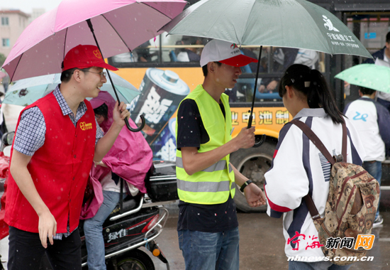 宁海新闻网讯 昨日,宁海城管义工在宁海中学、知恩中学、柔石中学、一职高(新校区)等高考考点外设立便民服务站,为考生以及家长提供便民服务,受到了大家的欢迎。图为义工正在雨中接送没带伞的考生。 (记者 惠广亮摄)