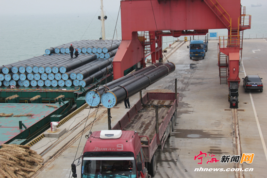 宁海新闻网讯 日前,磨盘山码头正在紧张有序地进行装卸天然气管道准备工作。据了解,此次装卸的钢管由中油宝世顺钢管有限公司从秦皇岛运出,用于甬台温天然气管道建设,铺设长度可达100公里。装卸完成后预计今年磨盘山码头的装卸总量可以达到1万多吨。 (章莉郑颖云徐孝杰摄)