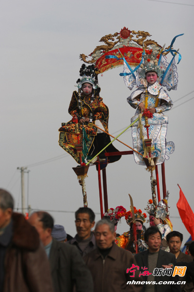 2 前童行会起源于明时,当时,塔山童氏的第十二世祖童濠率众族人完成了一项规模浩大的水利工程——杨柳洪砩。为了庆祝这个工程的完成,童氏族人举行了一场规模浩大的庆典活动。庆典中,人们出纸灯、迎境神、燃放自制的铳花、舞龙、耍狮,他们用这种结合了当地文化的方式来庆贺建砩成功,也借此表达对童濠为塔山童氏族人所作的贡献的敬意。 ![]() 自那以后,每年,童氏族人都会延续这场庆贺活动,还将其与当地的元宵节庆融合,在数百年的历史中不断进行丰富、创新和完善。至清代时,这场规模浩大的庆贺活动终于达到鼎盛,成为名噪浙东的一项特色盛会。 和其他地方的行会相比,前童行会有其独特的风格,其中最能体现这种不同的是行会中所采用的大量道具。其一便是大龙旗。大龙旗旗面高3米、宽5米,色白,绣龙,呈三角状。在前童行会中,大龙旗是行走在最前面的标志性旗帜,有开道引领的作用。这种龙旗开道的巡游形式,在浙东地区是独树一帜的。 在前童行会上,有一种叫“鼓亭”的道具是其中永恒的主角。一般来说,鼓亭的作用是用来置放指挥乐队所用的鼓的。但前童鼓亭的鼓亭却被赋予了更重要的含义。前童鼓亭以塔形作为基本形态,一般高约五至七米,上面附以繁复而精巧的雕刻和装饰,精巧而又大气。更奇特的是,因为这种塔形极符合塔山童氏的地标形象,因此,它一出现,便被童氏家族所认可,一时间,族人们纷纷效仿。制作出来的每一杠鼓亭,都以童氏族群中的名人或典故命名。可以说,前童的鼓亭表现了当地物产的富庶、工艺的精湛,更重要的是,它成为了童氏族人表达对先人敬仰之情的最重要的形式之一。 ![]() 抬阁是前童行会中另一种重要的民间艺术样式。抬阁一般长约二米,宽约一米,高约四米。抬阁下部为船形,雕有龙凤等吉祥图案。上层平面上,分别有前后、高低二层座椅,这些座椅分别固定在两根特制的铁仗上。在座椅上,有童男童女扮作中国传统戏曲人物,或凤冠霞帔、或峨冠博带、或金盔铁甲、或官冠蟒袍,为众人表演各种精彩节目,深受欢迎。而这些童男童女的人选,都是经过层层选拔选出的,这种机制,既保证了人选的优秀,也大大调动和激发了众多族人参与行会活动的积极性。 在前童行会中,像这样类似的民间艺术样式共有十余种,参与表演的人数达千人以上。正是这些精彩纷呈的活动内容,让喜好传统节庆形式的人们纷至沓来,形成了几万甚至十几万人围观前童行会的奇观。 |