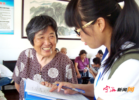 宁海新闻网讯 为了更好地了解“十二五”时期宁波市老龄事业发展状况,反映老年人的真实情况,为政府决策提供参考,日前,宁波工程学院的大学生在市、县老龄委有关领导的带领下来到杏树社区,对该辖区的30余位老年人进行了详细调查。 (李江林徐海蓉摄)