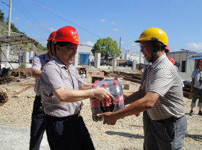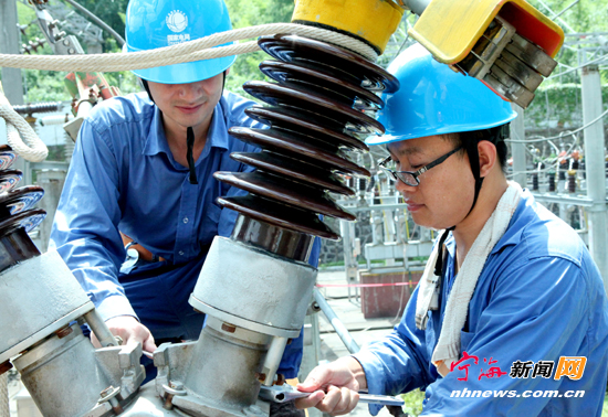 宁海新闻网讯 昨日上午,县供电公司变电运行检修人员冒着高温正在对35K千伏深甽变母线闸刀进行检修保养,以确保迎峰度夏期间深甽群众的日常用电。 (李江林胡云杰摄)