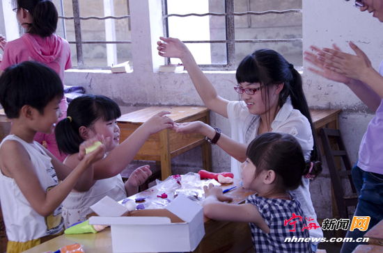 宁海新闻网讯 日前,宁波工程学院的几名学生来到桑洲镇开展“走近留守儿童,别让留守之花枯萎”暑期实践活动。他们对桑洲镇的留守儿童问题进行了调查,并邀请小朋友们参与趣味课堂活动。 (通讯员陈坚摄)