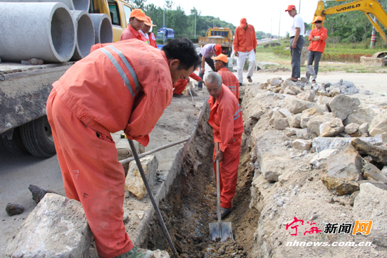 宁海新闻网讯 昨日,甬临线西店段一电器公司门口,县公路局梅林养护站的养护人员冒着高温进行接线接坡作业。为防止汛期出现雨水漫延,连日来,县公路局组织人员机械抓紧对该路段开展改造修复。(姚亮杜娟摄)