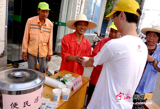 宁海新闻网讯 “这样一个便民凉茶点实在太好了,他们想的真周到。”一名骑车路过的陈大伯喝着凉茶连声道谢。针对持续高温天气,东海社区青年志愿者特意在社区门口设立便民凉茶点,为环卫工人、辖区居民和过往行人免费提供凉茶和防暑用品,受到广大市民的一致好评。(李江林 葛盛楠摄)