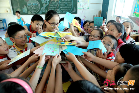 宁海新闻网讯 在第29个教师节到来之际,昨日上午,县实验小学教育集团实验校区四年级(一)班的小朋友们,将自己绘画和制作好的小纸画、小卡片等送到老师面前,祝老师节日快乐。一页页小纸画、一张张小卡片,虽然不够完美漂亮,但充满着一片真情。 (李江林王家法摄)