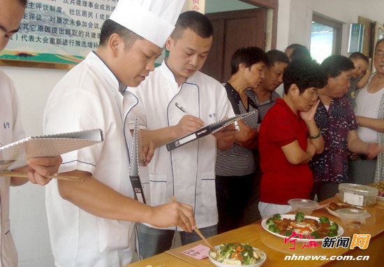 宁海新闻网讯 日前,县前社区举办了一场厨艺大赛。来自社区的30多位选手各显神通,纷纷拿出自己的烹饪绝活,一道道佳肴令人目不暇接,评委们根据选手菜样搭配的色、香、味、意、形等进行综合评分,许多居民对这些佳肴一一作了品尝,无不点头称赞。图为评委们正在为每道佳肴品尝打分。 (李江林杨璐璐摄)
