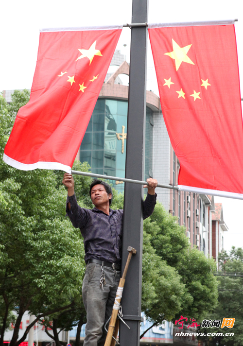 宁海新闻网讯 昨日,城区中山路上,一家广告公司工人正在路灯杆上悬挂五星红旗。随着国庆临近,越来越多的五星红旗飘扬在缑城的街道上,洋溢着热烈喜庆的气氛,成为一道美丽的红色风景线。(记者惠广亮摄)