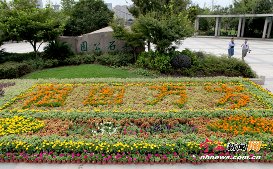 柔石公园门口的摆花《祖国万岁》。