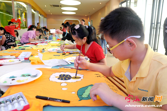 宁海新闻网讯 日前,县青少年活动中心举行了庆祝国庆亲子DIY手绘文化衫比赛,近百人参加了此项活动。孩子们以“绚丽童年、七彩未来”为主题,绘出了充满童真、童趣和创意的作品。