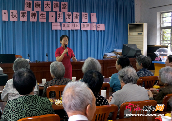 宁海新闻网讯 10月9日,跃龙街道北星社区举行主题为“秋季养生共度重阳”老年人健康讲座。社区还给前来参加讲座的老人们准备了小礼品,祝他们身体健康,提前过一个开心的重阳节。 (姚亮郑洁摄)