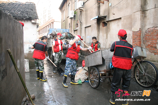 宁海救援干部忙着清扫垃圾