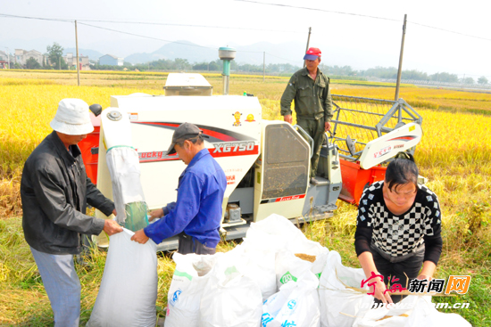 宁海新闻网讯 昨日上午,力洋镇小永农机专业合作社的顾小永,正在帮助海楼渔村的村民收割单季水稻。近几日来,我县15.5万亩单季稻陆续收割。尽管一些乡镇的单季水稻受“菲特”强台风和强降水影响,但由于各地农民积极采取补救措施,水稻受损不大。 (李江林李品锋摄)