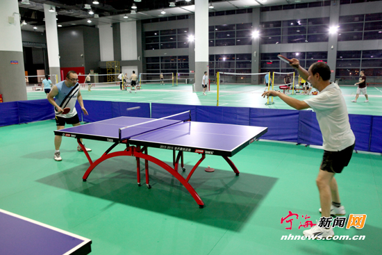 宁海新闻网讯 近日,宁海国际会展中心球馆对外开始试营业。该球馆目前分别拥有12个标准的乒乓球与羽毛球比赛场地,开放时间从早晨5点半到晚上10点,以尽量满足广大市民的需求。图为爱好运动的市民正在宁海国际会展中心球馆打乒乓球与羽毛球。(记者惠广亮摄)