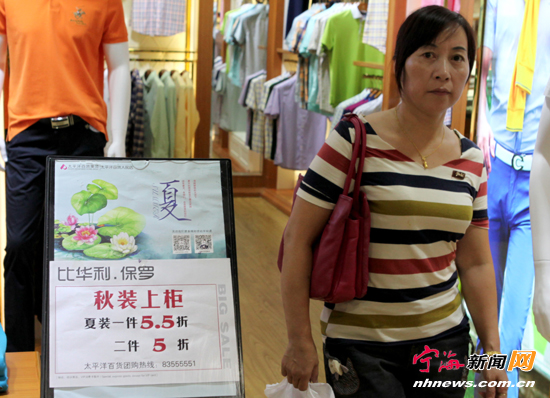 宁海新闻网讯 虽然还在三伏天,但秋装已经迫不及待地上架亮相了。连日来,缑城街头服装商场里,到处都是夏装出清打折的招牌,进行着最后的促销活动,为秋装腾出地儿来。图为昨日,一商城的某品牌打出了夏装5折的广告。 (记者惠广亮摄)