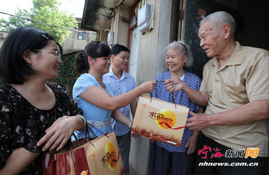 宁海新闻网讯 昨日上午,塔山社区工作人员正在桃源南路上门为80岁以上的辖区老人赠送月饼。中秋佳节临近,塔山社区举行“赏中秋团圆月、爱老显真情”活动,工作人员和志愿者一起带着一盒盒月饼,走进社区高龄老人和残疾人家中,给他们送去节日的问候和温馨的祝福。 (李江林袁莺摄)
