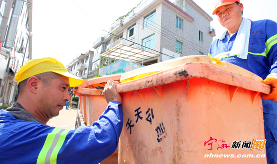 宁海新闻网讯 昨日下午,宁海银河垃圾中转站的胡师傅和他的工友正在北斗北路装运桶装垃圾。今年入夏以来,我县城区垃圾每天平均在330吨左右,为了城市的美丽整洁,全县千余名城市美容师们每天忙碌在岗位上,虽不是高温天气,但他们每天还是汗流浃背地工作着。(李江林薛珍摄)