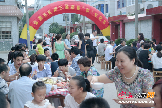 宁海新闻网讯 近日,跃龙街道怡惠社区举行了第三届楼巷“和”文化节。活动内容主要有百家欢聚宴、猜灯谜、自娱自乐文艺节目表演等。图为该社区居民各家自备食材,各自烹饪的菜肴、点心让邻里共同品尝的百家欢聚宴现场。 (惠广亮葛剑锋摄)