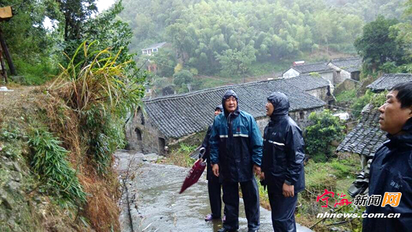 桑洲幕胡山村干部及时查看村道受损情况,因山上流下的水夹杂树枝落叶杂草,可能造成道路两旁排水沟的堵塞,村干部在巡视时第一时间疏通。(童晓静摄)