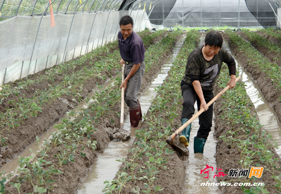 跃龙街道范家村蔬菜种植户在大棚里开沟排水。(惠广亮华建平摄)