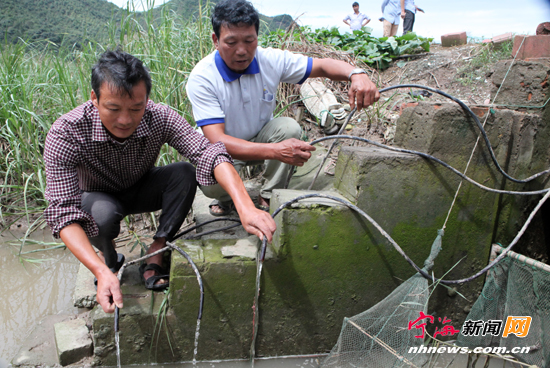 一市镇海水养殖户用小水管吸出养殖塘内的雨水。(李江林周如歆摄)