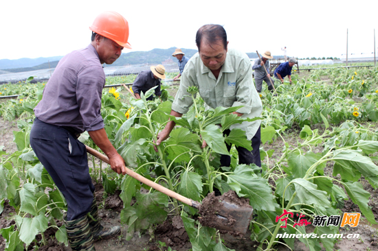 欢乐佳田农场的工人们正在扶起伏地的向日葵。(李江林王桂亚摄)