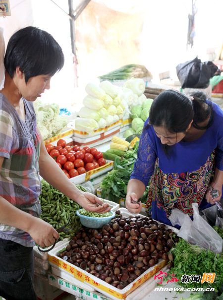 宁海新闻网讯秋日,地产新鲜板栗开始上市,价格在每斤8元左右,受到市民的青睐。昨日,城区大桥李菜市场的经营户告诉记者,随着大批地产新鲜板栗上市,前些日子占据市场的福建等地的外地板栗已经退市,本地栗子开始唱主角。(记者姚亮摄)