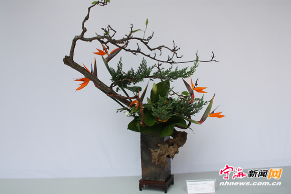 日前,2014宁波市“鄞州园林杯”高级插花员职业技能大赛在鄞州区举行,由大佳何成校花艺班学员组成的宁海园林队代表我县参赛。我县潘晓燕获得第一名,图为潘晓燕获奖作品。(记者 王银宁 摄)