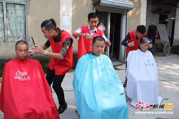 9月29日上午,县城乡社区服务中心联合县党群服务中心和桃源街道有关部门,在该街道塘溪村老年协会举行“喜迎国庆 温暖重阳”活动。志愿者们为老人们送去了理发、配锁、盲人推拿、健康咨询、电器维修等服务,还免费为村里的老人发放近150副老花镜。图为志愿者们在为老人理发。(汉茗 胡惠祥 摄)