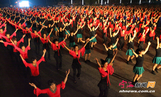 宁海新闻网讯 10月21日晚,由县平安办、县文广新闻出版局、县妇联联合举办的“平安宁海美好人生”千人广场舞展风采活动在宁海国际会展中心广场举行。来自全县18个乡镇(街道)的50支广场舞蹈队的1000多名队员,用精湛的舞蹈演绎了平安繁荣的美好生活和良好的精神风貌。(李江林徐乖娟摄)