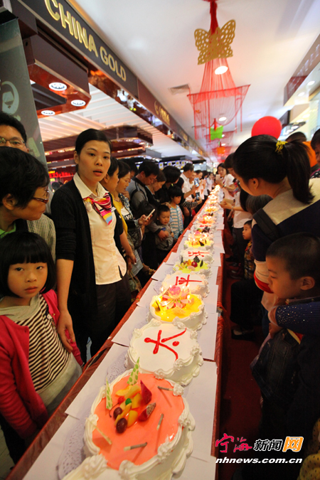 宁海新闻网讯 10月24日,太平洋百货人民店黄金珠宝区过道上摆放着70多个蛋糕拼接成的18米蛋糕长廊,庆祝开业18周年,近千名市民共享着甜美的蛋糕,感受着店庆快乐。 (记者李江林摄)