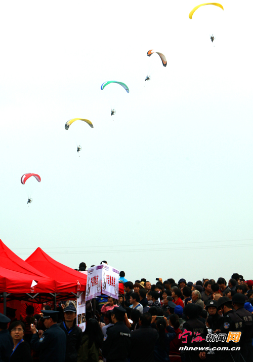 宁海新闻网讯 昨日上午,2014中国(宁海)运动休闲大会——通用航空运动表演项目在新围垦的下洋涂举行,飞机、动力伞、热气球等精彩的空中表演,吸引了县内外近万名市民和游客近距离观看。图为动力伞正在下洋涂上空进行队形表演。 (记者李江林摄)