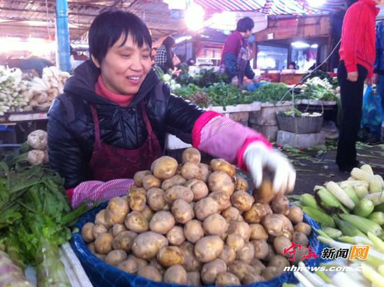 宁海新闻网讯 近期,我县本地秋洋芋大量上市,并占据菜市场,挤走了外地洋芋。昨日,大桥李菜市场的摊贩对记者说:本地洋芋因口感好,一直受市民宠爱,刚上市时每斤八九元,现在则每斤四五元,也非常好卖。而外地洋芋价格要便宜一半多,但现在很少有人买。 (记者姚亮摄)