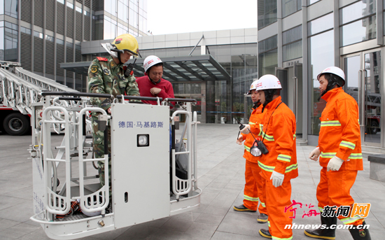 11月19日,亚太物业宁海分公司在县消防大队的指导下,在金融中心大楼举行高楼消防应急、电梯困人逃生解救演练。(记者惠广亮摄)