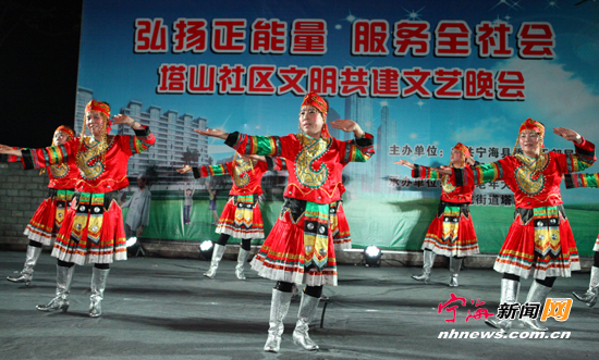 宁海新闻网讯 11月21日晚,由县委老干部局、跃龙街道办事处主办的“弘扬正能量、服务全社会”塔山社区文明共建文艺晚会在东景花园广场举行,京剧、越剧、拉丁舞、柔力球、时装秀等精彩节目赢得了居民们的热烈掌声。图为东景花园的居民正在表演舞蹈《我欠草原一首歌》。 (李江林袁莺摄)