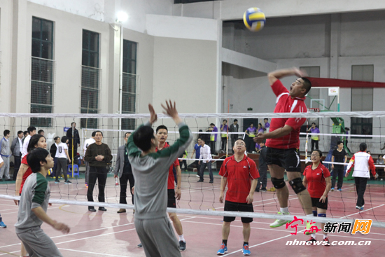 宁海新闻网讯 11月25日晚,2014年宁海县首届职工气排球混合团体赛在星海中学举行。本次赛事由县职工体育活动协会主办,共有12家企事业单位组队参加。经过紧张激烈的争夺,最后,县职教中心、农信联社、工行宁海支行代表队分获前三名。 (记者惠广亮摄)